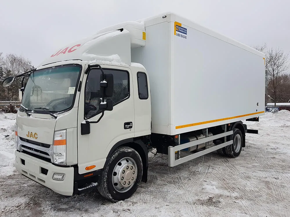 JAC 120 – рефрижератор среднетоннажный. Предельная общая масса – 12 т. Оптимален по сочетанию категорий «качество-цена», эксплуатируется в целях транспортировки продтоваров, требующих по условиям хранения поддержания заданного диапазона температур (-20+12 градусов).